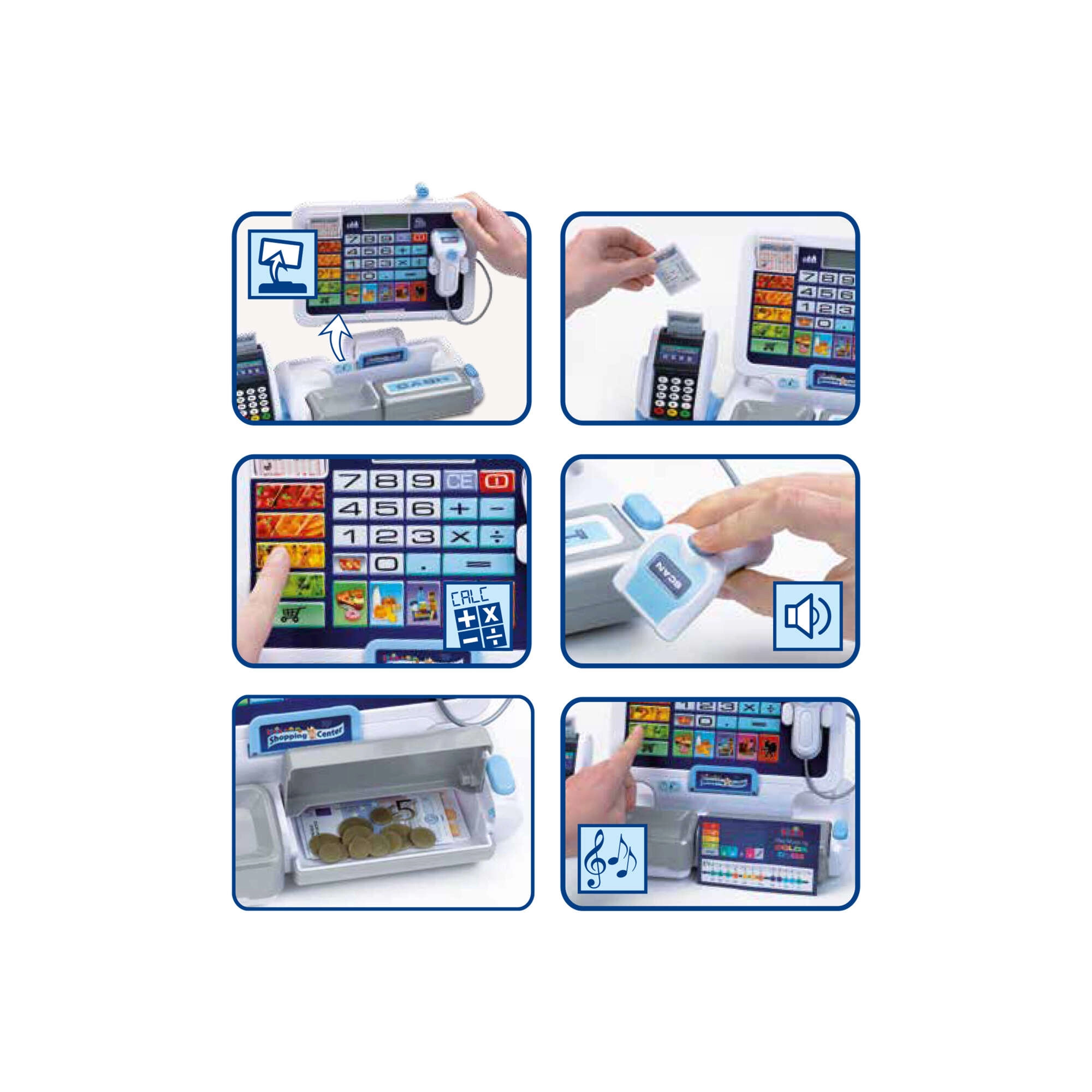 В комплекта има богат набор от аксесоари: евромонети и банкноти с различни номинали, касови бележки, платежна карта и картонче с песнички за още по-забавна игра. Касата е отличен избор за деца от 3 години, които обичат да играят на магазин и искат да упражняват смятане, фината моторика и общуването с клиенти.