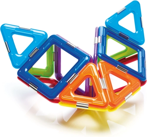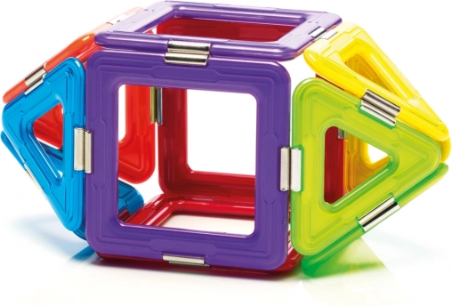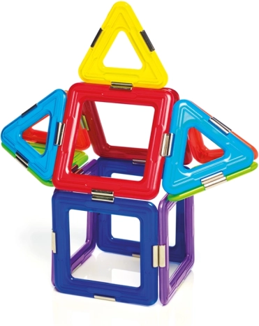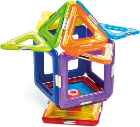 Комплектът съдържа общо 6 магнитни квадрата, 8 триъгълника и 1 спинър, което предлага широки възможности за експериментиране. Този комплект е не само забавен, но и образователен, като развива детските умения като пространствено въображение, координация, концентрация и креативност.