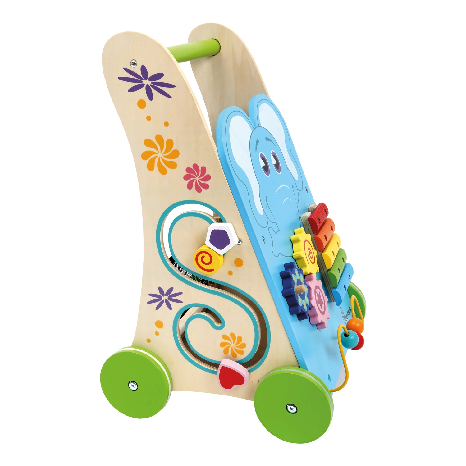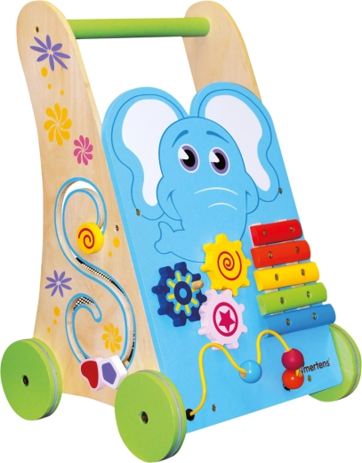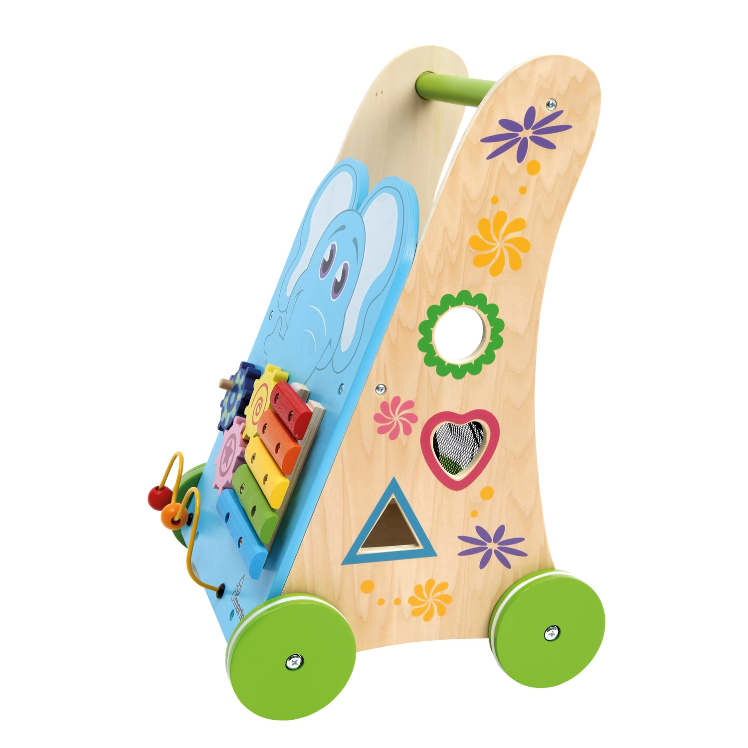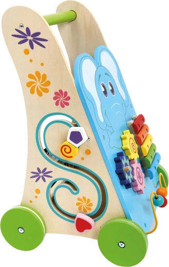 Тази мултифункционална дървена проходилка помага на децата да тренират равновесие, координация и фина моторика. Предният панел е пълен с активности: музикален ксилофон с палка, зъбни механизми, лабиринт с мъниста и сортер, които подпомагат съсредоточаването и логическото мислене.
