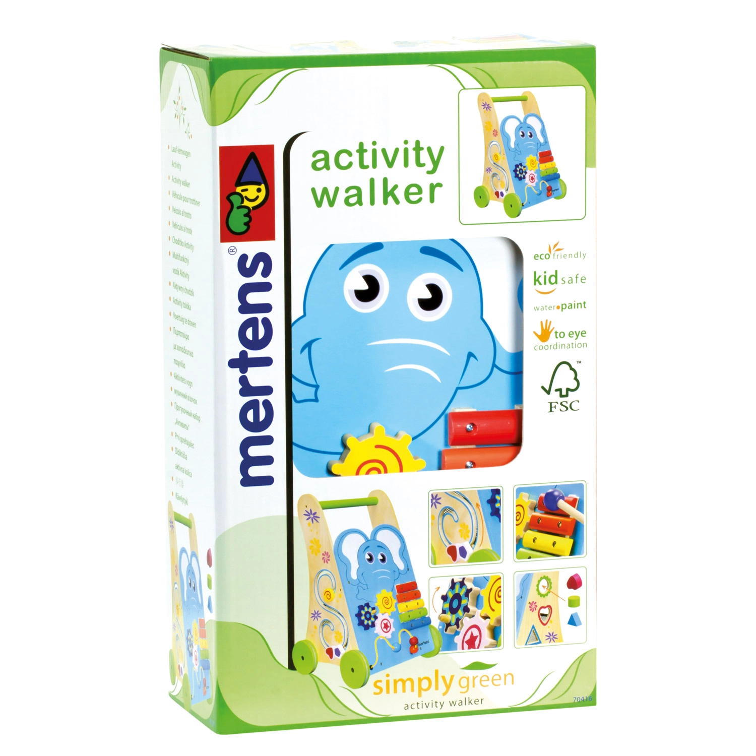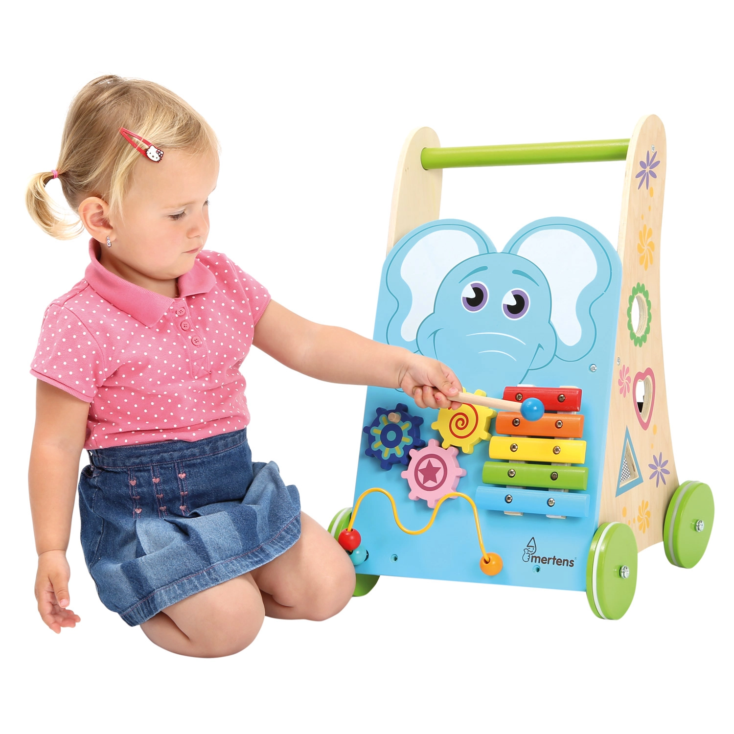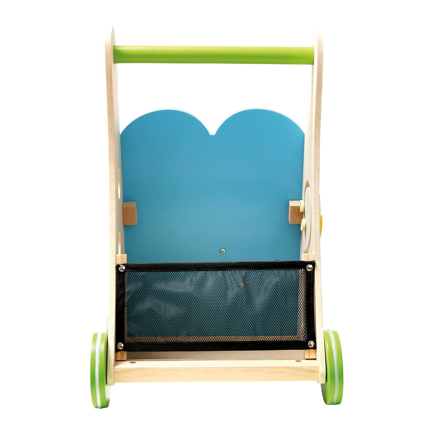 Тази мултифункционална дървена проходилка помага на децата да тренират равновесие, координация и фина моторика. Предният панел е пълен с активности: музикален ксилофон с палка, зъбни механизми, лабиринт с мъниста и сортер, които подпомагат съсредоточаването и логическото мислене.