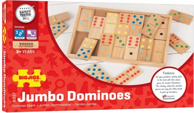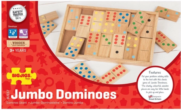 Джъмбо дървеното домино е прецизно оразмерено за малки деца, които лесно се справят с вдигането и подреждането на плочките. Основните предимства на тази игра включват: