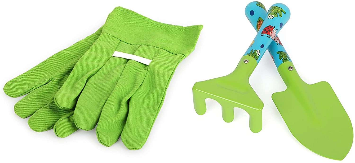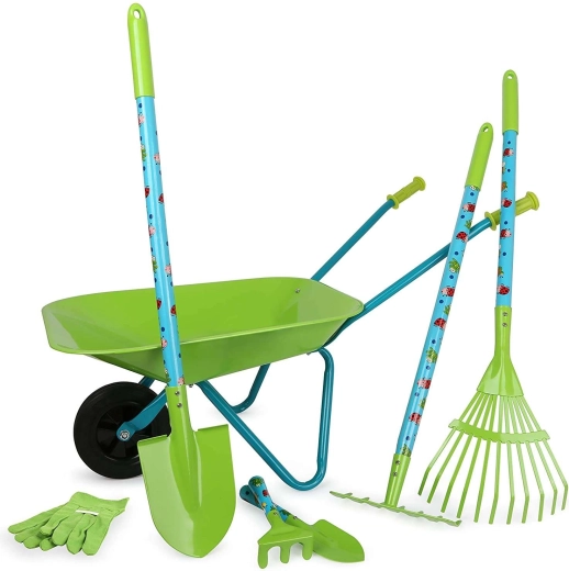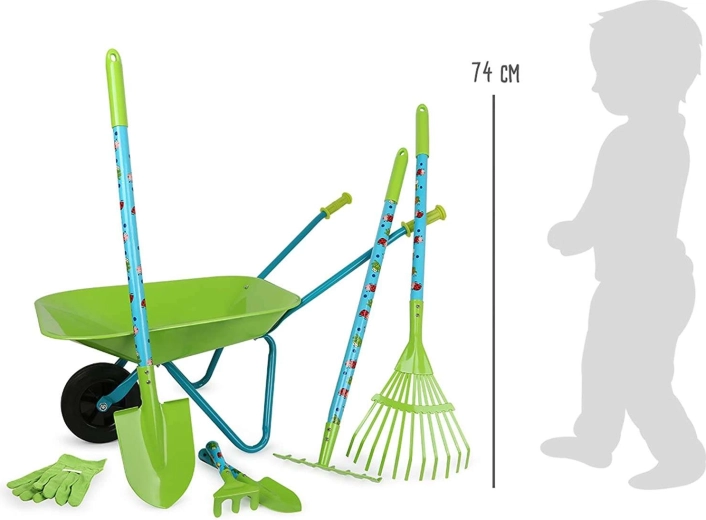 Този голям детски градинарски комплект SMALL FOOT предлага всичко необходимо на малкия градинар: стабилна количка, лопата, гребло, гребло за листа, малко гребло, лопатка и защитни ръкавици. Повечето части са от метал, което ги прави здрави и издръжливи, но същевременно леки и лесни за управление за детски ръце.