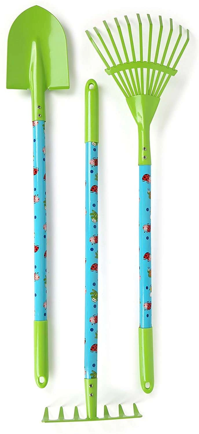 Дългите инструменти са приблизително 70 см за удобно гребане и копаене, а по-късите ръчни инструменти са около 15–20 см. Благодарение на ергономичните дръжки и детските размери инструментите се държат удобно и подпомагат правилните навици при работа в градината. Комплектът насърчава децата към активно движение, учене на отговорност и споделени моменти с родителите.