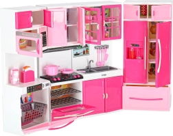 Тази модерна кухничка за кукли въвежда децата в свят на фантазия и имитация на ежедневни дейности. Четирите свързани сегмента позволяват да се подреди цялостна кухня с всички важни елементи – от котлони с фурна до хладилник и мивка. LED подсветените котлони и звуците придават на играта по готвене реалистичен облик.