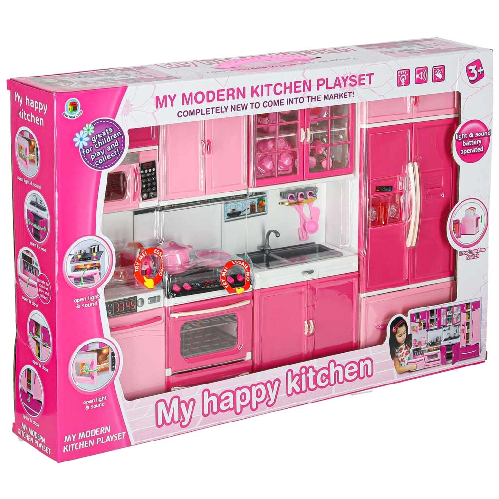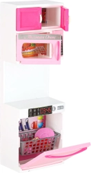 Комплектът включва микровълнова печка и съдомиялна, котлони с фурна, витрина с мивка и хладилник с чекмедже. Децата ще се насладят на пълен сценарий на готвене, печене и почистване.