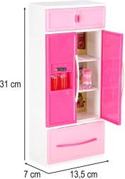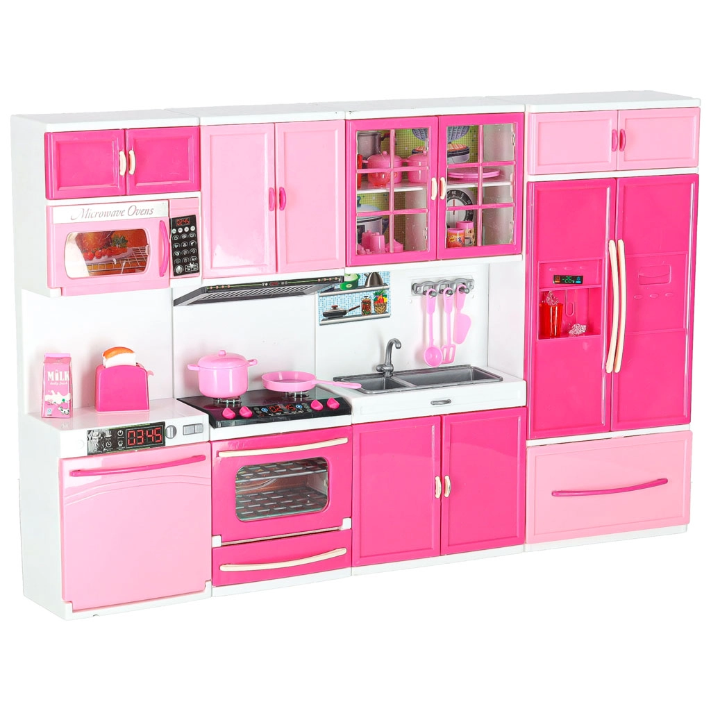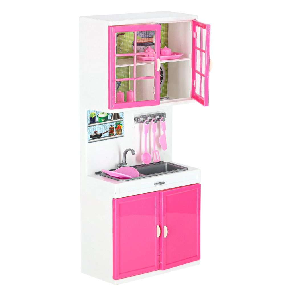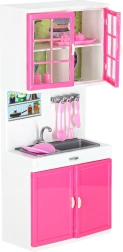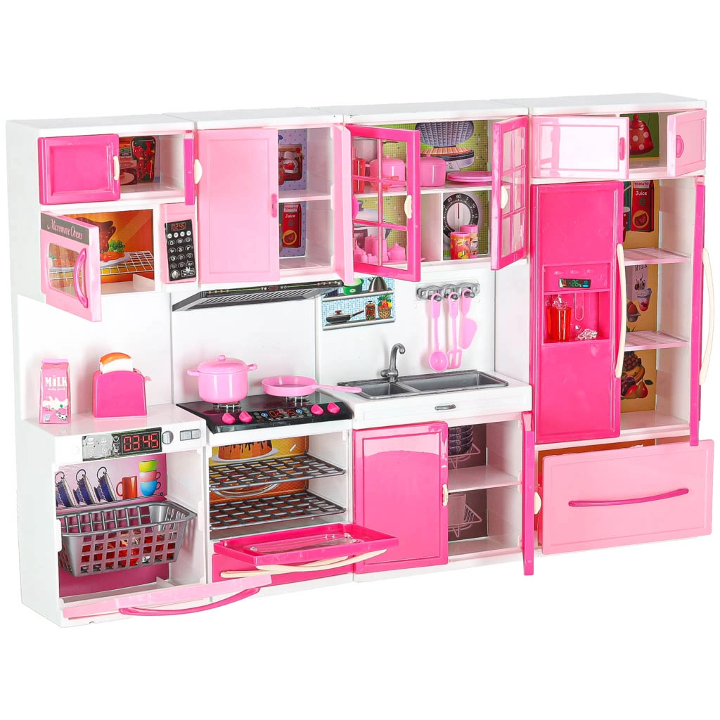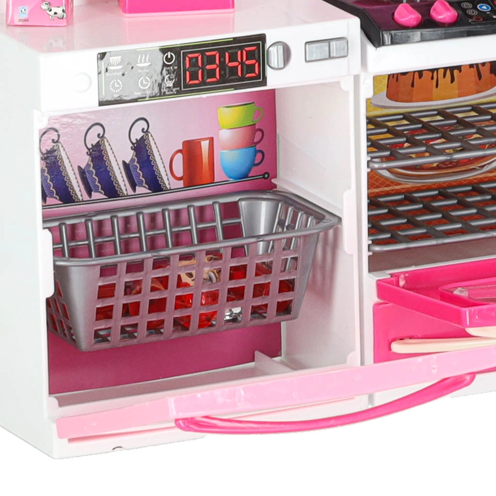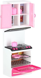 В комплекта има богати аксесоари: тенджери с капаци, тиган, тостер с подвижен лост, съдове, чаши, кутийки, „кутия мляко“, кухненски принадлежности на куки и „кубчета лед“. Отваряемите шкафчета, изтеглящото се чекмедже и рафтовете учат децата на ред, развиват фината моторика и социалните умения.