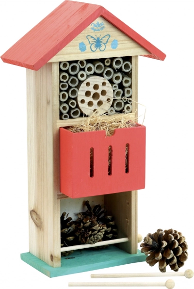 Vilac Хотел за насекоми червен е проектиран да осигурява дом за пчели, калинки и други полезни насекоми, което помага за подкрепа на биоразнообразието във вашата градина. Конструкцията включва тръбни отвори и пространство за материали като шишарки, с което се създава идеална среда за насекомите.