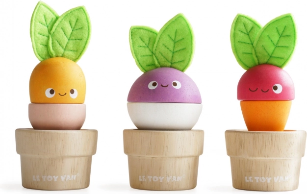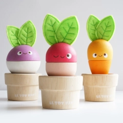 Очарователният комплект дървени саксии със зеленчуци от LE TOY VAN подпомага фината моторика, координацията око–ръка и въображението. Децата могат да смесват и сглобяват отделните части в морков, репичка и цвекло или да създават свои комбинации. Играчката е изработена от устойчива дървесина, има филцови листенца и е ръчно дооцветена с нетоксични бои на водна основа.