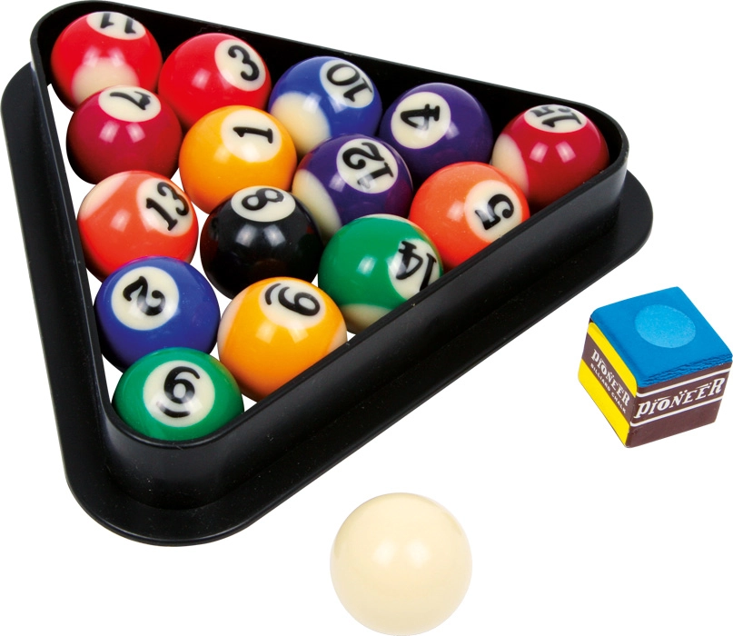 - Комплектът съдържа: 2 щеки, билярдни топки, триъгълник и тебешир.