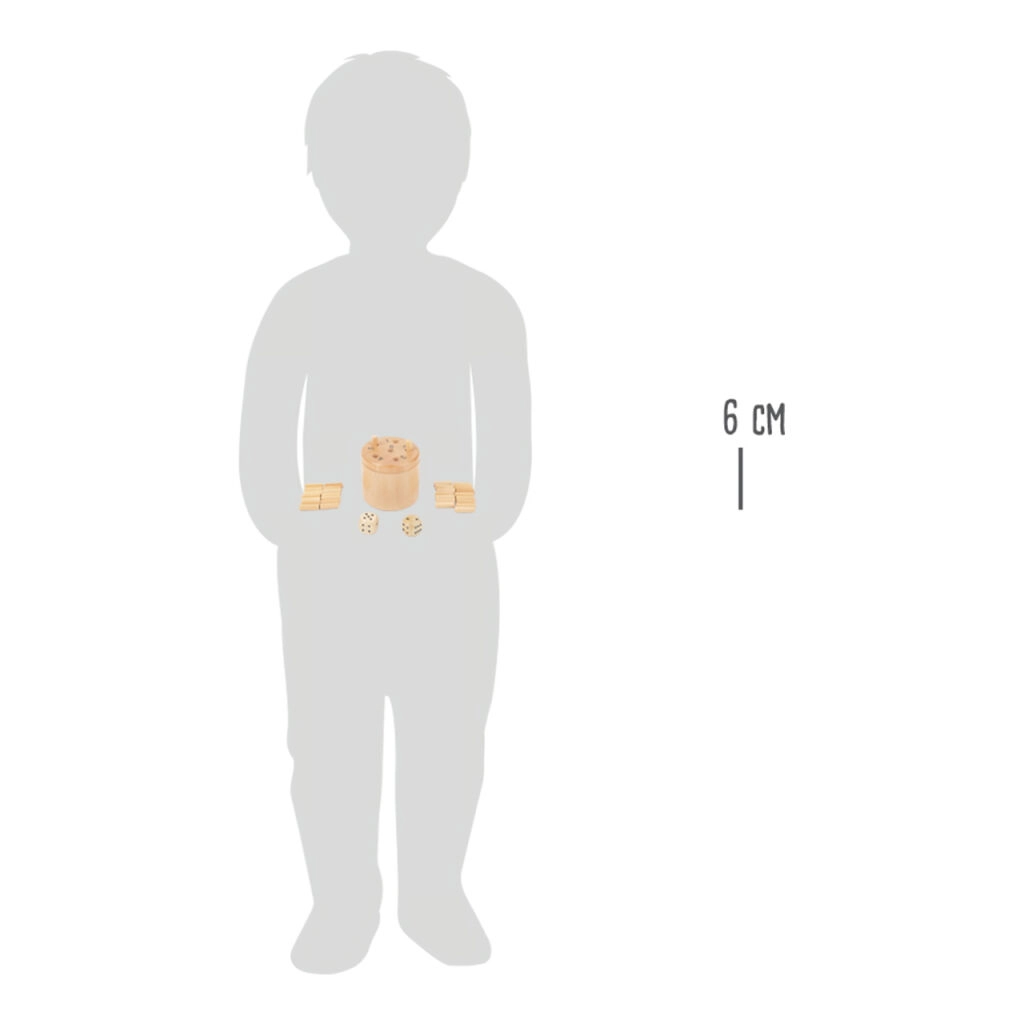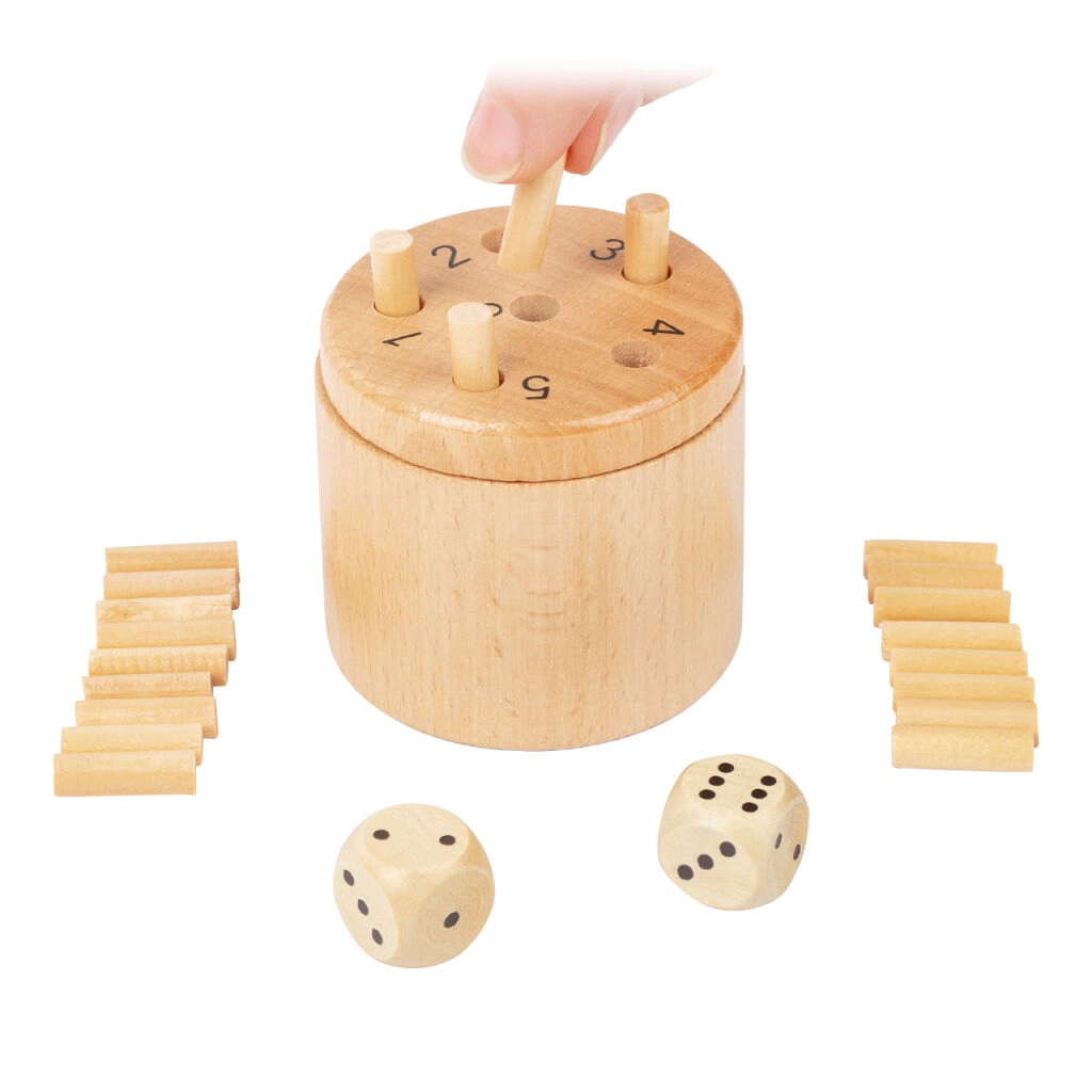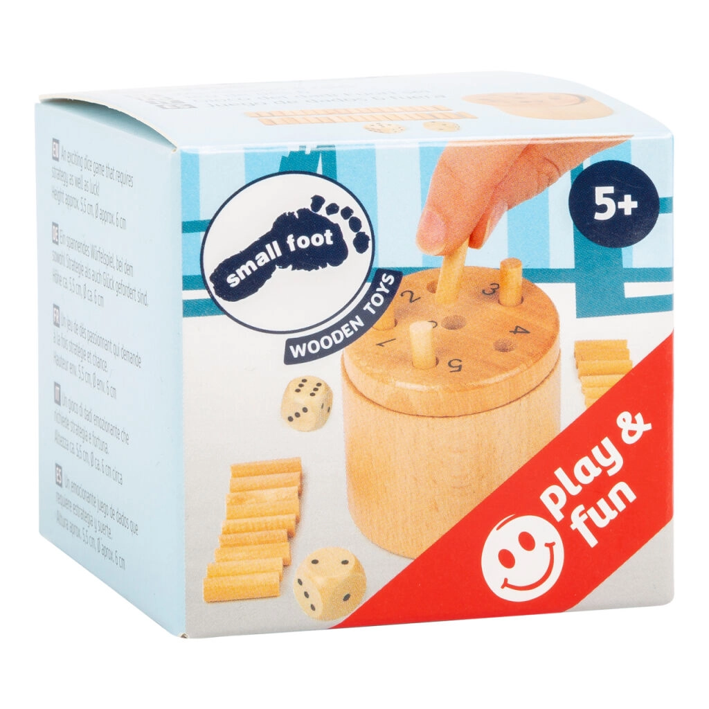 След играта прибирате всички пръчици и зарове в дървения цилиндър. Никакви изгубени части и играта винаги е готова за път.