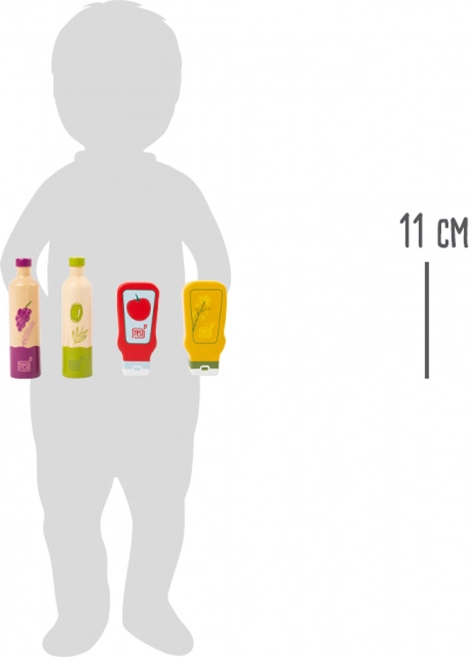 Всяко шишенце има отчетливи илюстрации (олио, оцет, кетчуп, горчица), благодарение на които децата лесно разпознават съдържанието и се включват в играта на готвене.