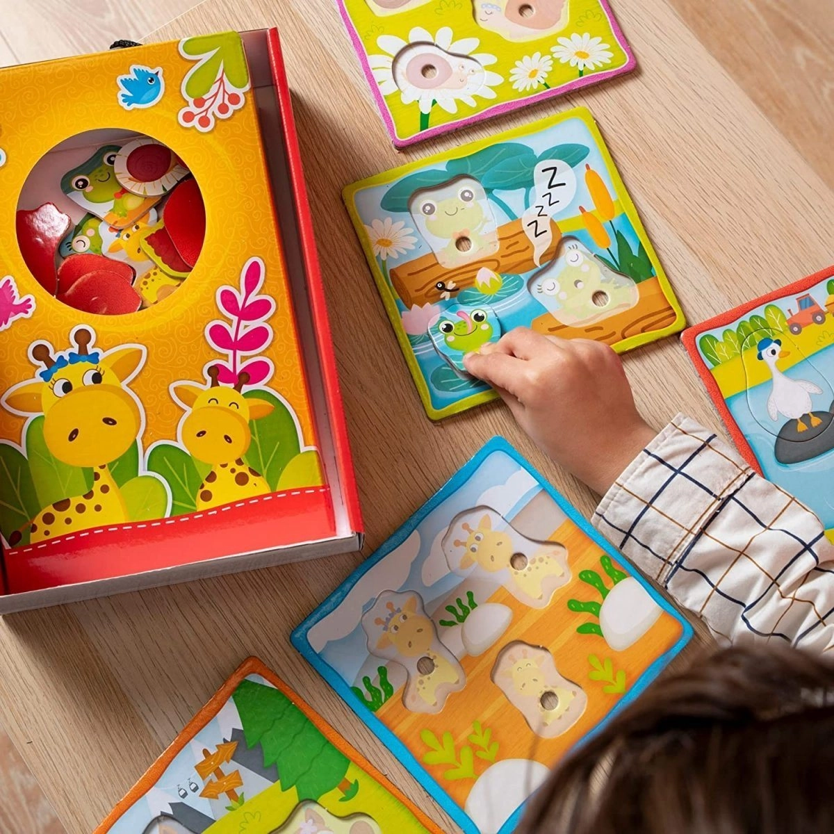 Открийте игривия дидактически комплект, в който децата съчетават малките животни с тяхната мама и татко, опознават животните и естествената им среда, докато тренират търпение, внимание и фината моторика. Комплектът е разработен за най-малките – простите контурни елементи се държат удобно и се вграждат лесно.