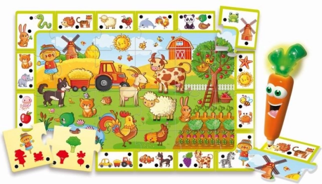 Открийте забавна игра за най-малките, в която децата с помощта на говореща писалка във формата на морков опознават селскостопанските животни. Те подреждат двустранни елементи и изпълняват лесни тестове, които развиват уменията им. Идеална за деца в предучилищна възраст от 3 години, играта подпомага логическото мислене, разпознаването на животни и правилното отговаряне с помощта на интерактивната писалка.