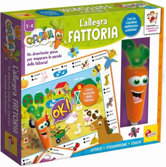 CAROTINA от LISCIANI предлага забавна и образователна игра на тема село. Децата подреждат картина от двустранни елементи и с помощта на говорещата писалка – морков – отговарят на лесни въпроси тип викторина. Интерактивният подход мотивира към откривателство и учене чрез игра.