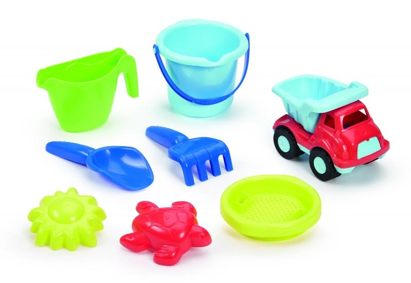 Този пъстър комплект за пясък предлага всичко, от което децата се нуждаят за творческа игра в пясъчника или край водата. Леката количка с дълга дръжка и стабилни колела лесно превозва кофичката, лейката и останалите аксесоари. Издръжливата пластмаса и безопасните форми осигуряват удобно и безгрижно забавление – независимо дали строите пясъчен замък или превозвате товар със самосвалчето.