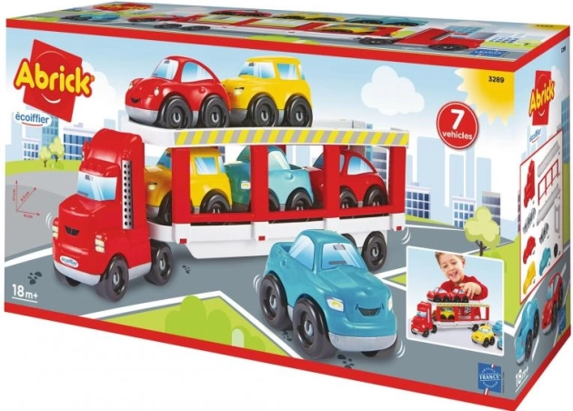 Атрактивен Abrick транспортьор за превоз на колички! Транспортьорът е оборудван със сгъваща се рампа, която позволява лесно товарене и разтоварване на шест цветни колички.