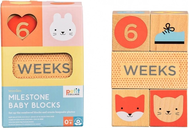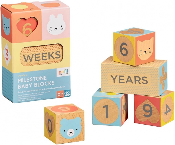 Стилните етапни кубчета от Petit Collage помагат да запечатате най-важните моменти от вашето бебе и бременността. Комплектът от FSC сертифицирана букова дървесина предлага цветни щампи, цифри и символи за създаване на оригинални и ясни снимки. Идеални за раждане, първите месеци и години, както и за бременна фотосесия.