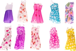 Комплектът включва рокли в различни цветове и шарки, включително точки, сърчица и цветя – идеален за творческо комбиниране при обличане на куклите.
