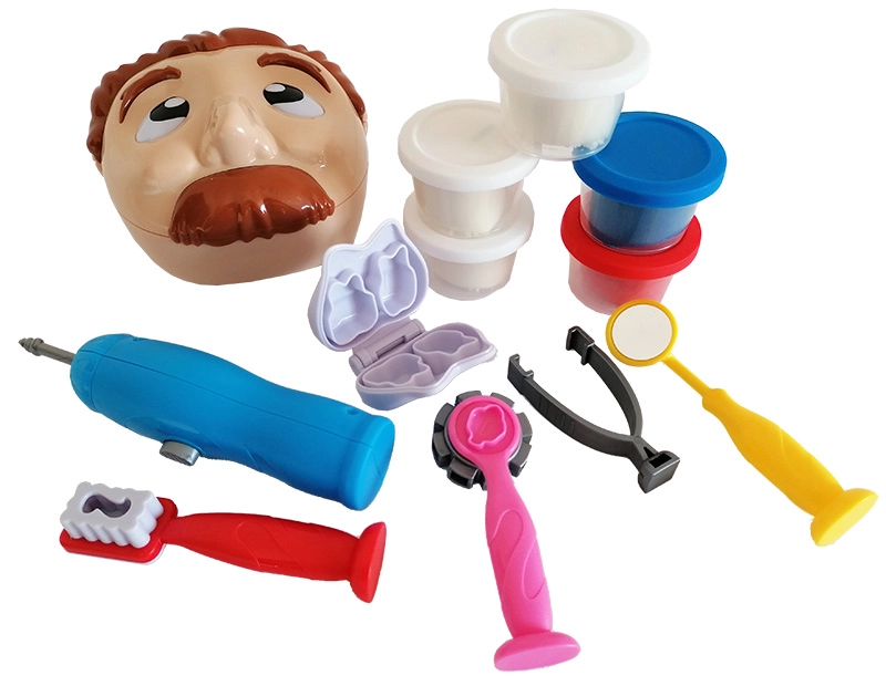 - Зъболекарски инструменти (бормашина, клещи, огледалце, четка), форма за зъби, многцветна пластилинова маса
