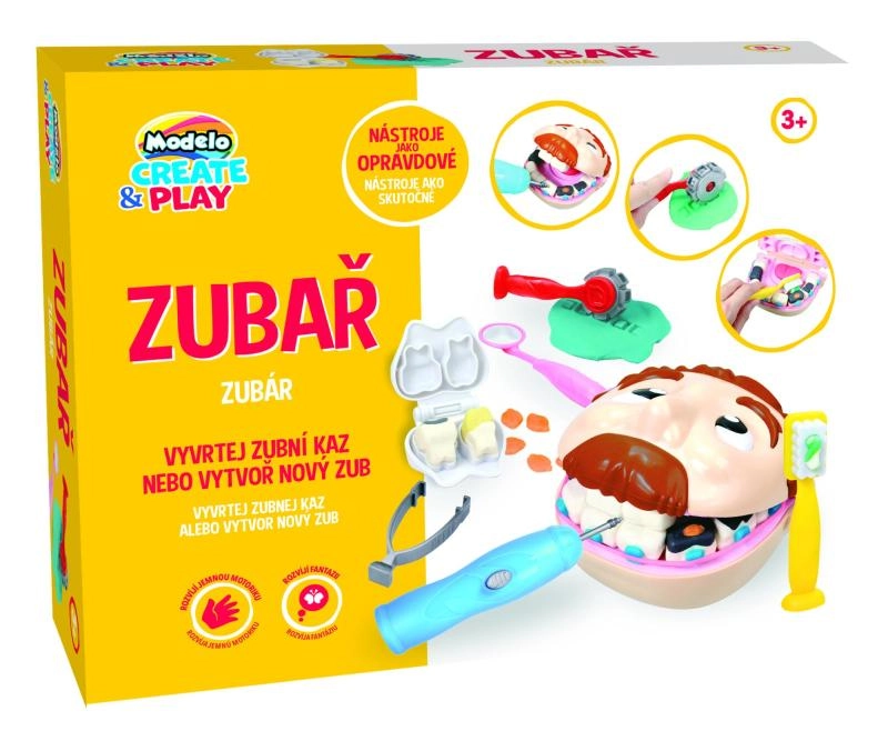 Превърнете децата в малки зъболекари с креативния комплект Modelo. Моделирайте зъби, пробийте кариес, поставете брекети и пломбирайте – всичко с помощта на лесно оформяща се пластилинова маса, която не боядисва и не изсъхва. Играта развива фината моторика, креативността и помага за преодоляване на страха от зъболекар.