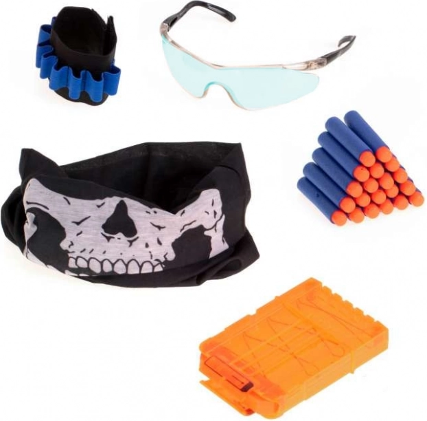 Комплектен детски сет за пянични стрели: удобна тактическа жилетка с държачи и джобове, 20 пянични стрели, пластов пълнител за 6 стрели, лента за китка за „муниции“, предпазни очила в син цвят и бандана. Жилетката има дишаща мрежа, универсален детски размер и регулиращ се велкро колан за комфортно носене.