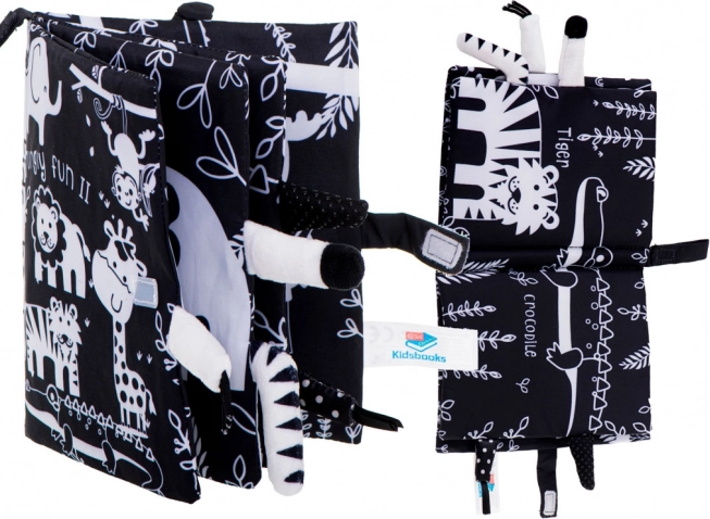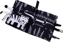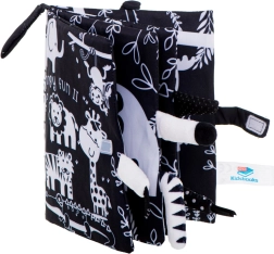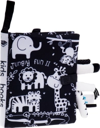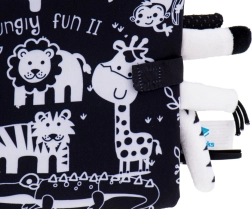 Тази мека сетивна книжка е идеален спътник за бебета от 0+. Контрастните черно–бели илюстрации на сафари животни (жираф, лъв, слон, маймунка, тигърче, крокодил) привличат вниманието и подпомагат правилното развитие на зрението през първите месеци. Изпъкналите меки опашки канят към докосване и тренират захвата.