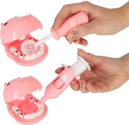 Забавен и поучителен дентален комплект с хипопотам, който помага на децата да преодолеят страха от зъболекаря и да усвоят правилна хигиена. Съдържа всичко необходимо за малкия зъболекар: хипопотам с подвижни зъби, четка и паста, дентално огледалце, спринцовка, „бормашина“, пинсета, скалер и образователни карти.