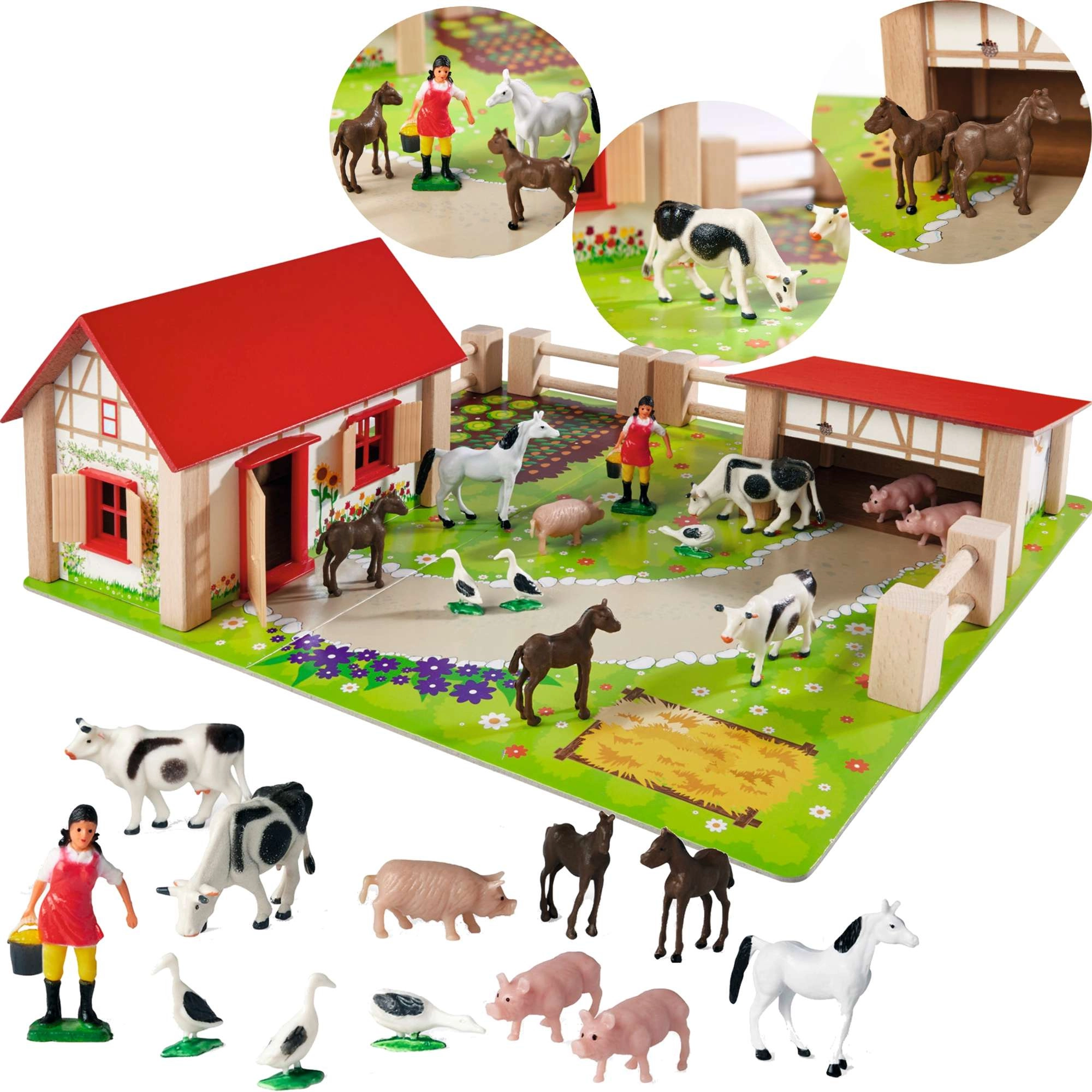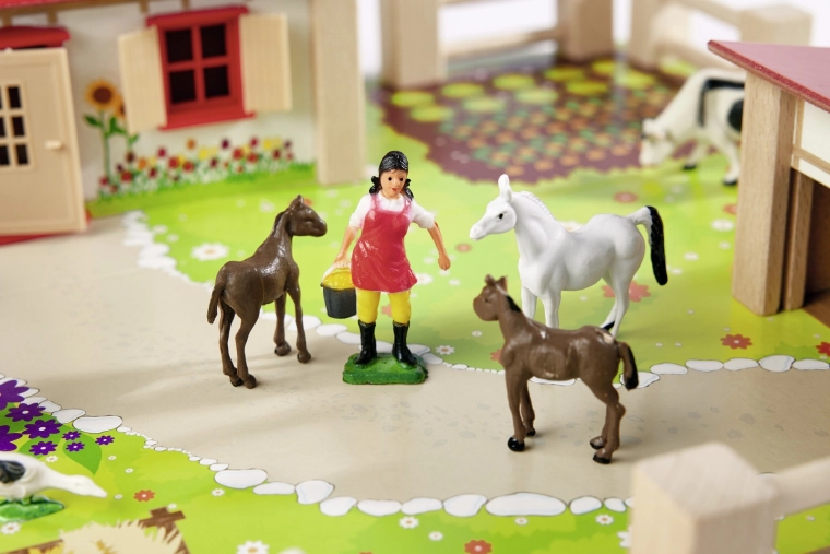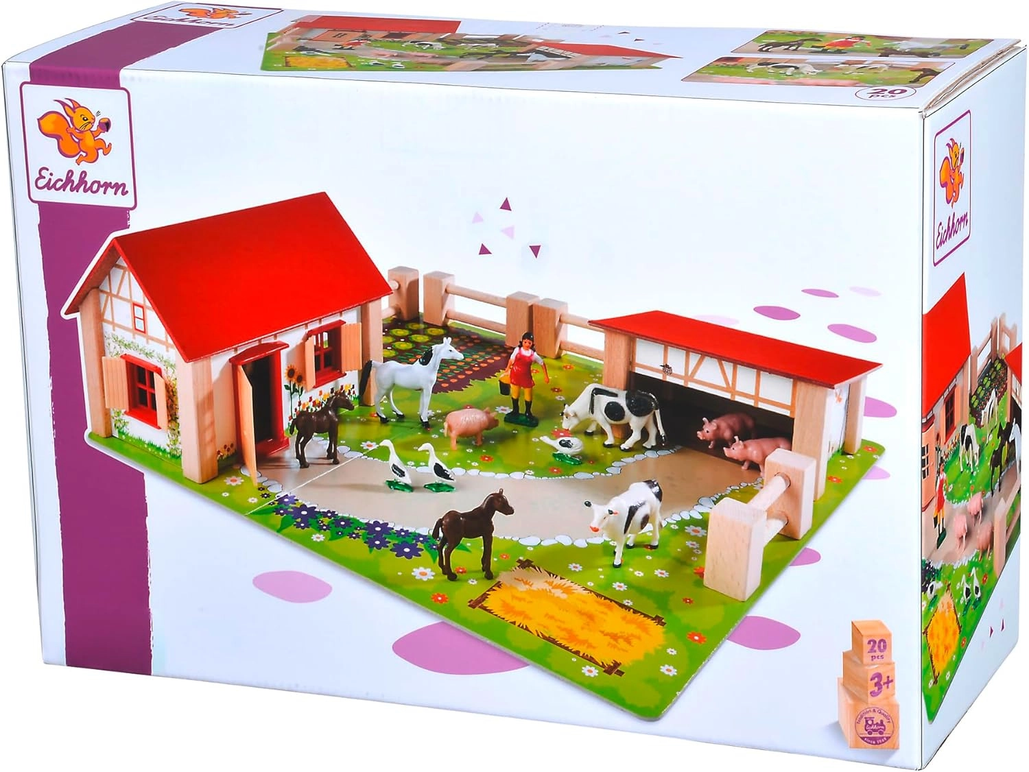Открийте чара на селото с детската дървена ферма EICHHORN – пълен игрален комплект с къщичка, стая, огради и 12 реалистични фигури на животни. Предлага здраво дървено изпълнение, цветна играчна подложка и богати аксесоари за креативна игра и развитие на въображението. Идеален за деца от 3 години, които обичат животните и ролева игра по грижа за фермата.