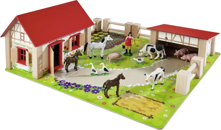 Дървената ферма EICHHORN ще зарадва всеки малък фермер. Комплектът включва къщичка с червен покрив, стая, огради и детайлни фигури на животни, включително кончета, кравички, прасенца и гъски. Част от комплекта е и цветна подложка с пътеки и градинка, която лесно насочва децата към създаване на собствени сцени и истории. Здравата дървена конструкция и устойчивите материали осигуряват дълъг живот и безопасна игра.