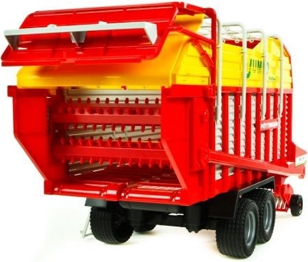 За автентичната игра се грижат функционалните елементи: ръчната манивела управлява дозиращите валци, въртящия се долен събирач и изхвъргача. Ремаркето може да стои самостоятелно върху опорния крак и да се прикачи към всеки трактор BRUDER от сериите 20xx, 21xx и 30xx. Качествената пластмасова изработка гарантира дълъг живот дори при ежедневна игра.