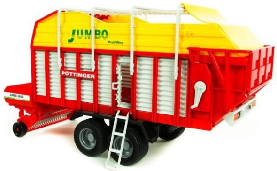 Донесете на двора истинската атмосфера на жътвата. Ремаркето-събирач BRUDER Pöttinger Jumbo 6600 се отличава със здрава конструкция, характерен червено-жълт дизайн и прецизни детайли, които точно пресъздават оригиналната земеделска техника. Децата лесно отварят бордовете и задните врати, сгъват стълбата, а свалянето на покривните дръжки им позволява да надникнат във вътрешността на ремаркето.
