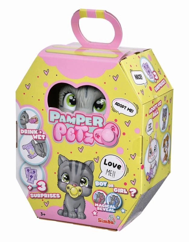 Котенцето PAMPER PETZ е идеалният любимец за деца, които ще се насладят на магията на осиновяването и грижата за малка играчка. Играчката може да пие истинска вода от шишенце и след това да пишка в пелена, която сменя цвета, когато е мокра. Вълшебната лапичка подсказва дали котенцето е момче или момиче.