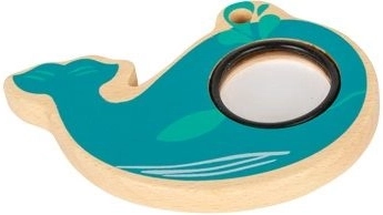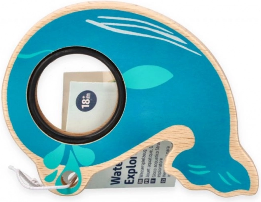 Тюркоазеният кит от дърво и пластмаса пасва идеално в малката детска ръчичка. Помага да се тренират захватът, координацията ръка–око и първите манипулации с предмети по забавен начин.