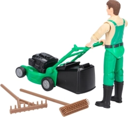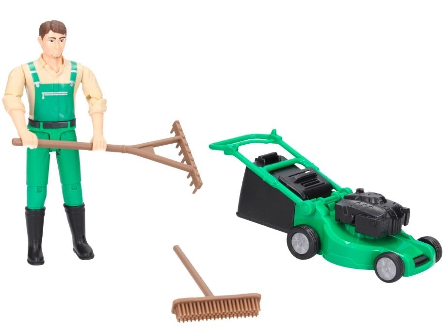 Комплектът BRUDER BWORLD градинар с косачка предлага на децата реалистична игра на грижа за тревните площи. Фигурката има шарнирни крайници и ръце, пригодени за стабилно захващане на инструментите, така че лесно може да бута косачката, да гребе или да мете.