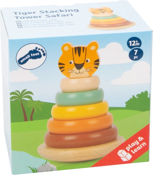 Тази впечатляваща нанизваща кула с тигров мотив е не само красива играчка, но и отличен инструмент за развитие на детските умения. Състои се от 7 части, включително основа и шест цветни ринга, които могат да се нанизват на пръчка с глава на тигър. По този начин децата тренират координацията око-ръка и разпознаването на форми.