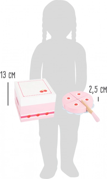 Децата могат да разделят тортата на парчета и отново да я съединяват благодарение на велкрото – идеално за упражняване на фината моторика и реалистична игра на сладкарница.