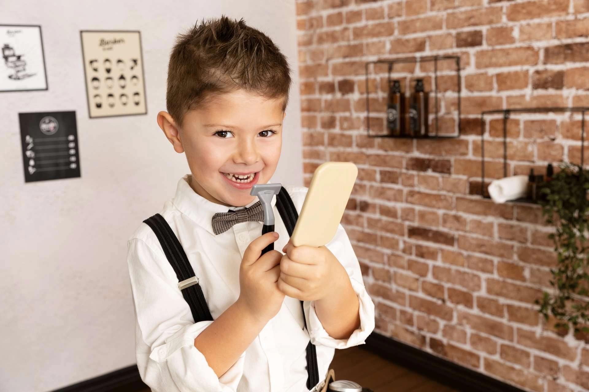 Огледалце, ножици, гребен, четка, самобръсначка и други принадлежности осигуряват часове безопасно, креативно забавление за деца от 3 години.