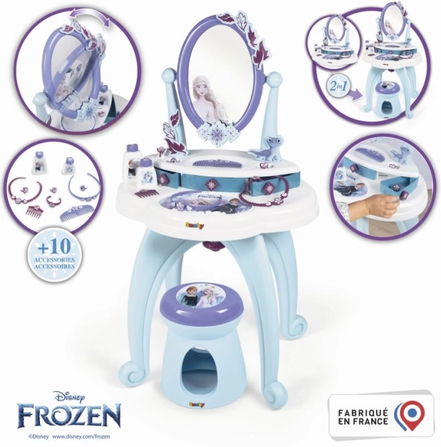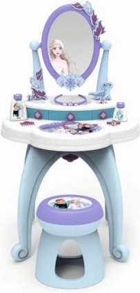 Тоалетка 2-в-1, вдъхновена от Замръзналото кралство, предлага всичко, от което малките принцеси се нуждаят за своята ежедневна грижа. Включва голямо въртящо се огледало и богати аксесоари, като парфюми и други козметични допълнения.