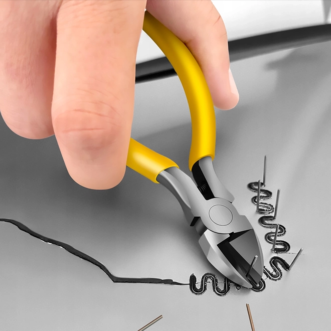 Комплектът включва нож и клещи за оформяне на пластмаса, което прави процеса на ремонт по-ефективен.