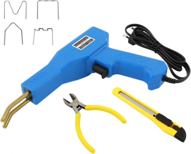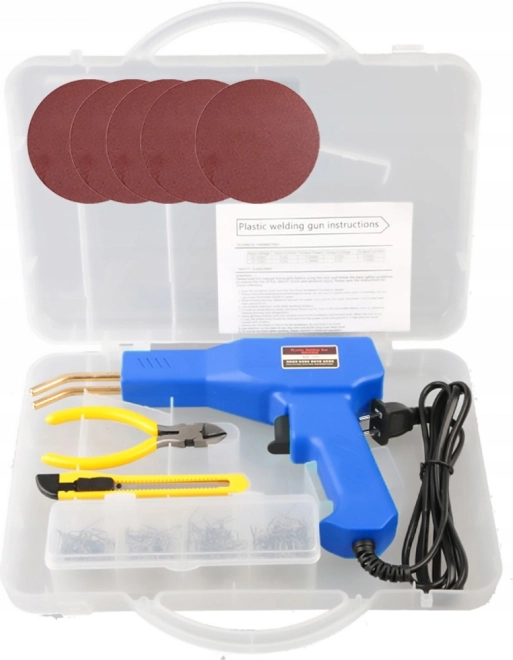 Компактна машина за заваряване на пластмаси с 200 стоманени скоби е идеална за ремонт на пластмасови части и заваряване на пластмаси. Включени са нож и клещи, които улесняват оформянето на пластмасата, както и практичен калъф за лесно пренасяне и съхранение.