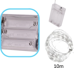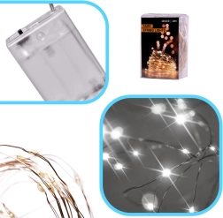 Фина LED гирлянда на тънка тел с дължина 10 м и 100 LED в цвят студено бяло създава празнична атмосфера у дома и през цялата година. Благодарение на захранването с батерии можете да я поставите навсякъде, телчицата лесно се скрива в елхови клонки, буркани или декорации и осигурява романтично осветление без грижи за електрозахранването.