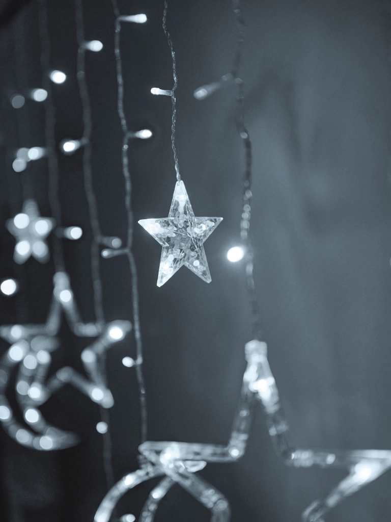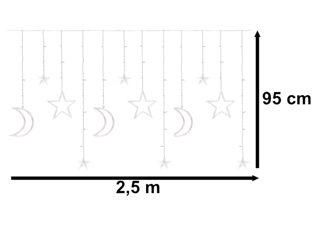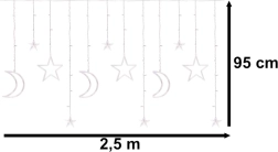Щедрата ширина от 2,5 m и мотивите на луни и звезди превръщат всеки прозорец или стена в уютна светлинна сцена. Студено бялата светлина подчертава зимното настроение и внася чист, модерен вид в интериора.