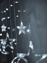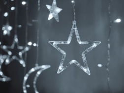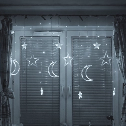 Създайте в дома си вълшебна атмосфера с висящата LED завеса с мотив луна и звезди. Предлага елегантна студено бяла светлина, 8 светлинни режима и захранване от мрежата за непрекъснат блясък. Благодарение на 138 LED и степен на защита IP44 е идеална като коледна и целогодишна украса за хол, спалня или детска стая.