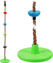 Забавно и безопасно детско въже за катерене с цветни дискове и кръгла пластмасова люлка за игри на открито. Подпомага движението, координацията и силата. Разполага с товароносимост 100 кг и здраво въже с дебелина 2,6 см, идеално за детска площадка или къщичка на дърво.