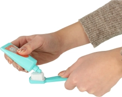- Хипопотамче с подвижни зъби, 2 отделни зъбчета, четка, паста, зъбно огледалце, спринцовка, „бормашина“, пинсета, скалер, обучителни картончета (EN)