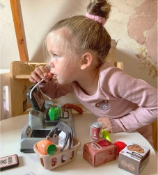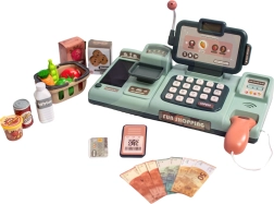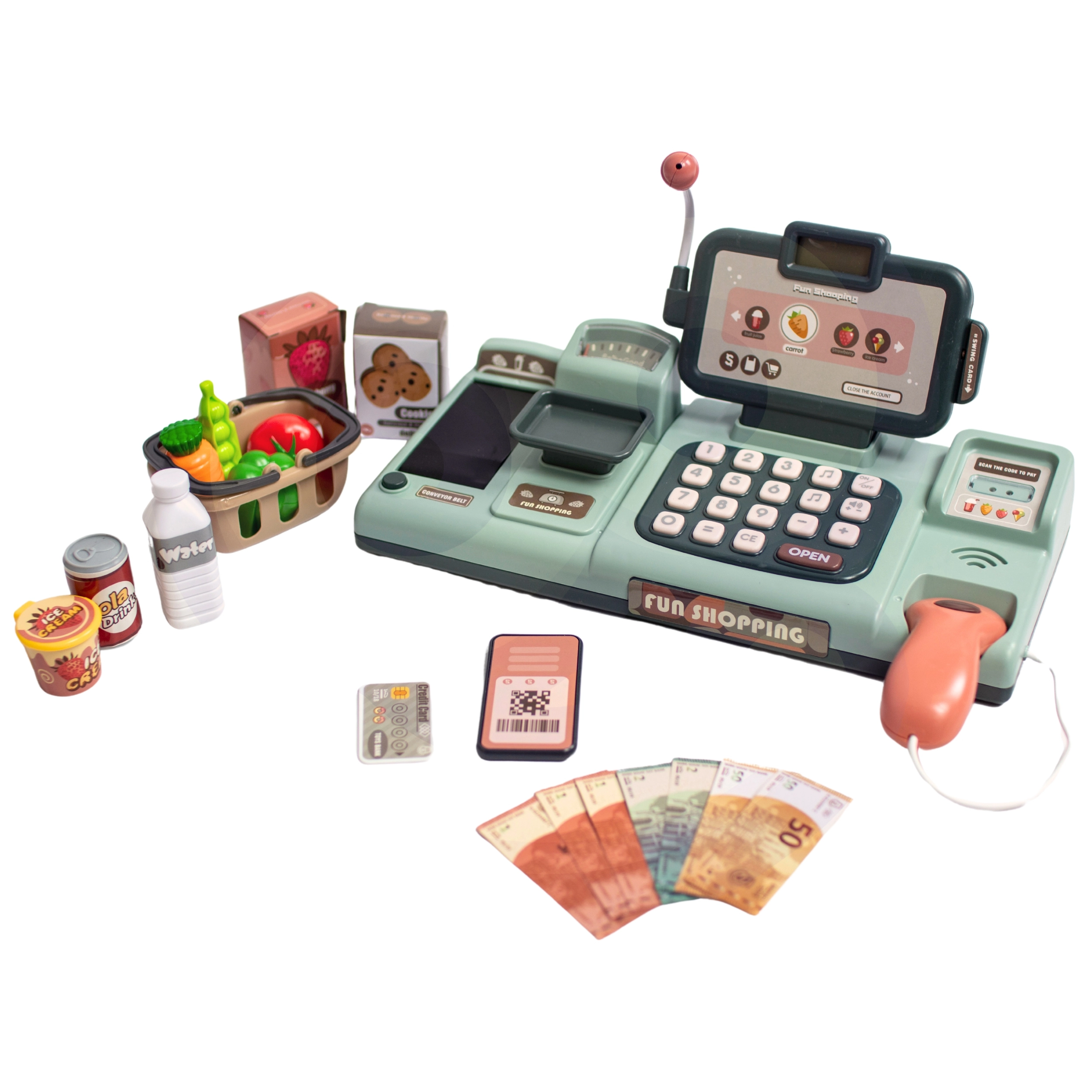 Касата включва терминал, благодарение на който детето може да извършва плащания в брой, с карта или със смартфон, точно както възрастните в магазина. Интегрираната везна и подвижната лента позволяват на детето да подрежда покупките и да влезе в истинската роля на продавач.