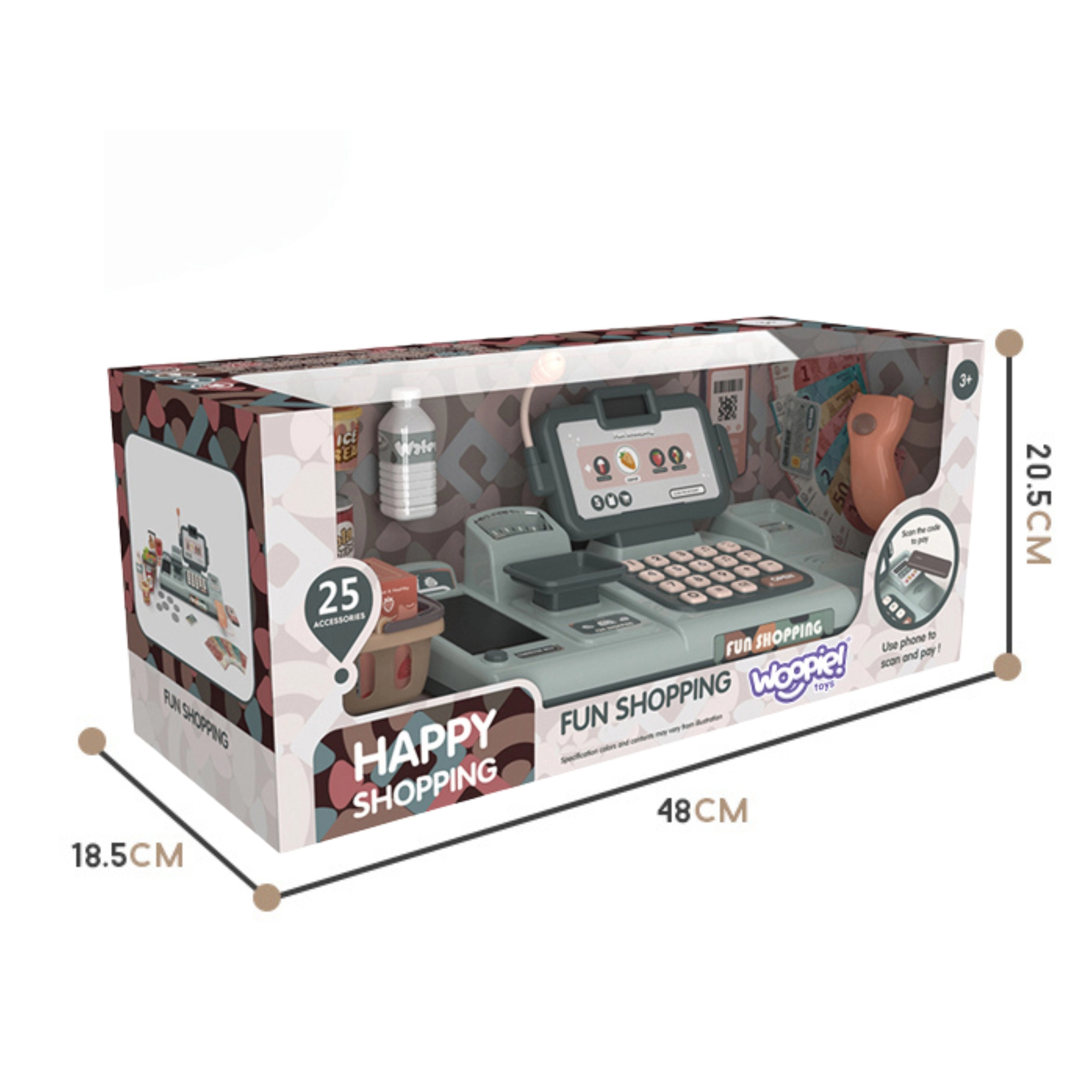 Детската каса Woopie е задължителна за всеки малък търговец. Оборудвана е с калкулатор с LCD дисплей, на който се показват цифри, както и звуков скенер за продукти, осигуряващ реалистично изживяване при пазаруване.