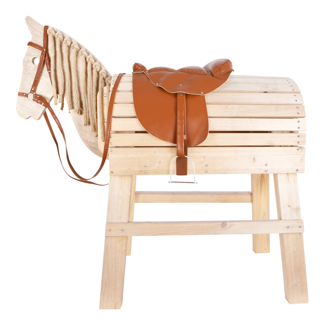 Юздата без удило и универсалната кройка на седлото са чудесни за повечето детски дървени и люлеещи се коне и подкрепят реалистичната ролевa игра.