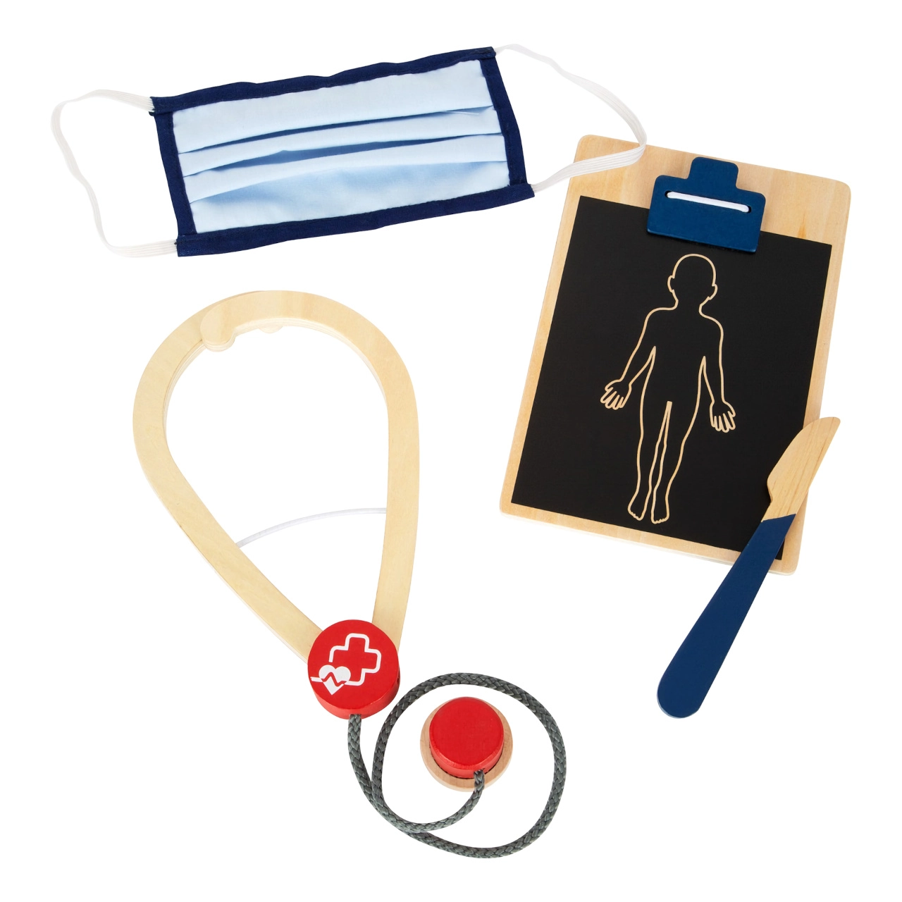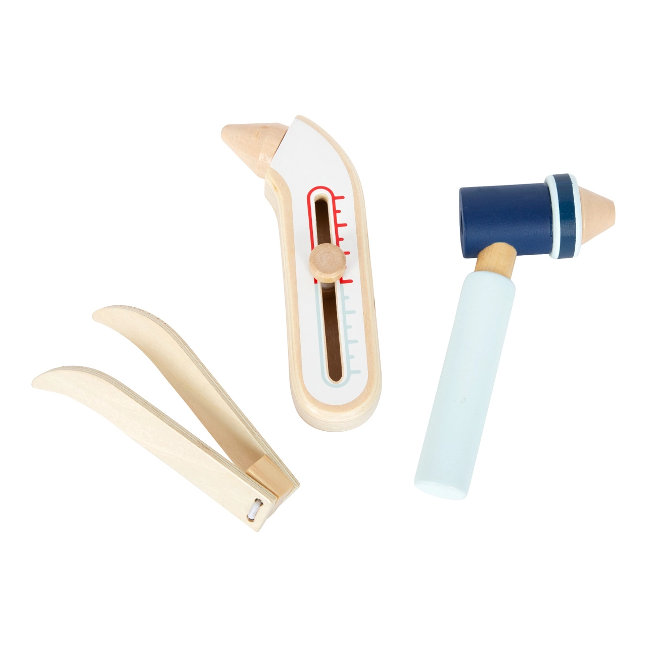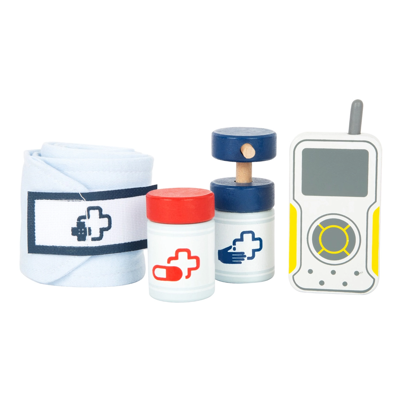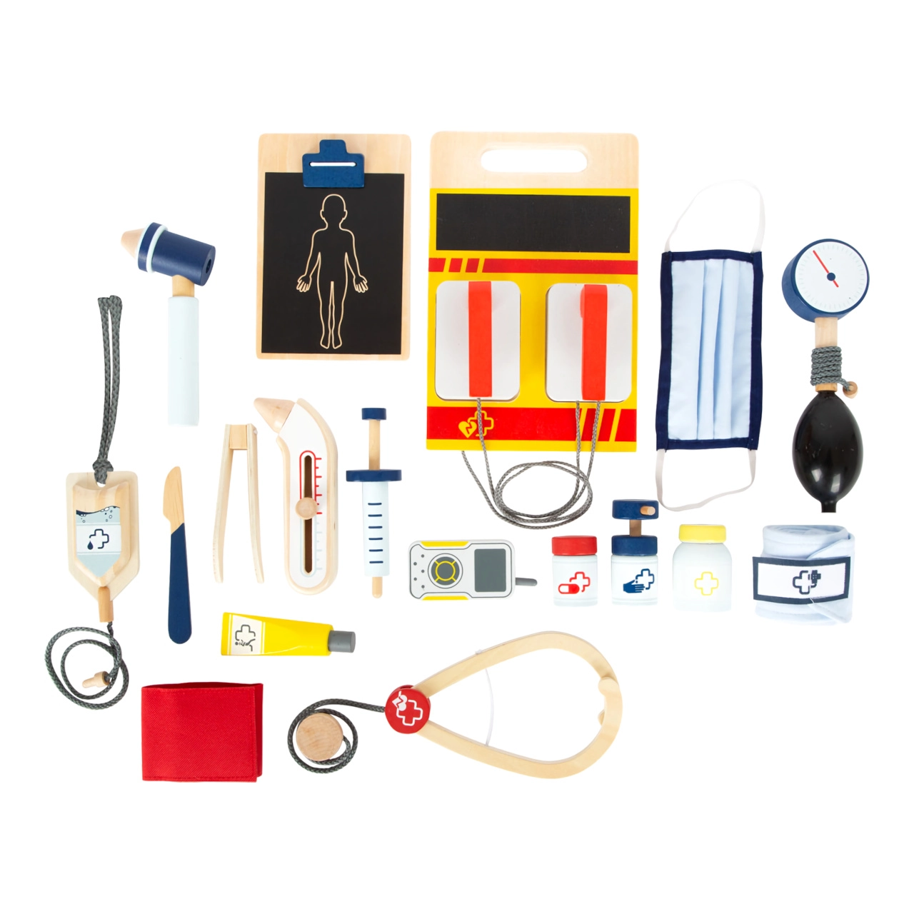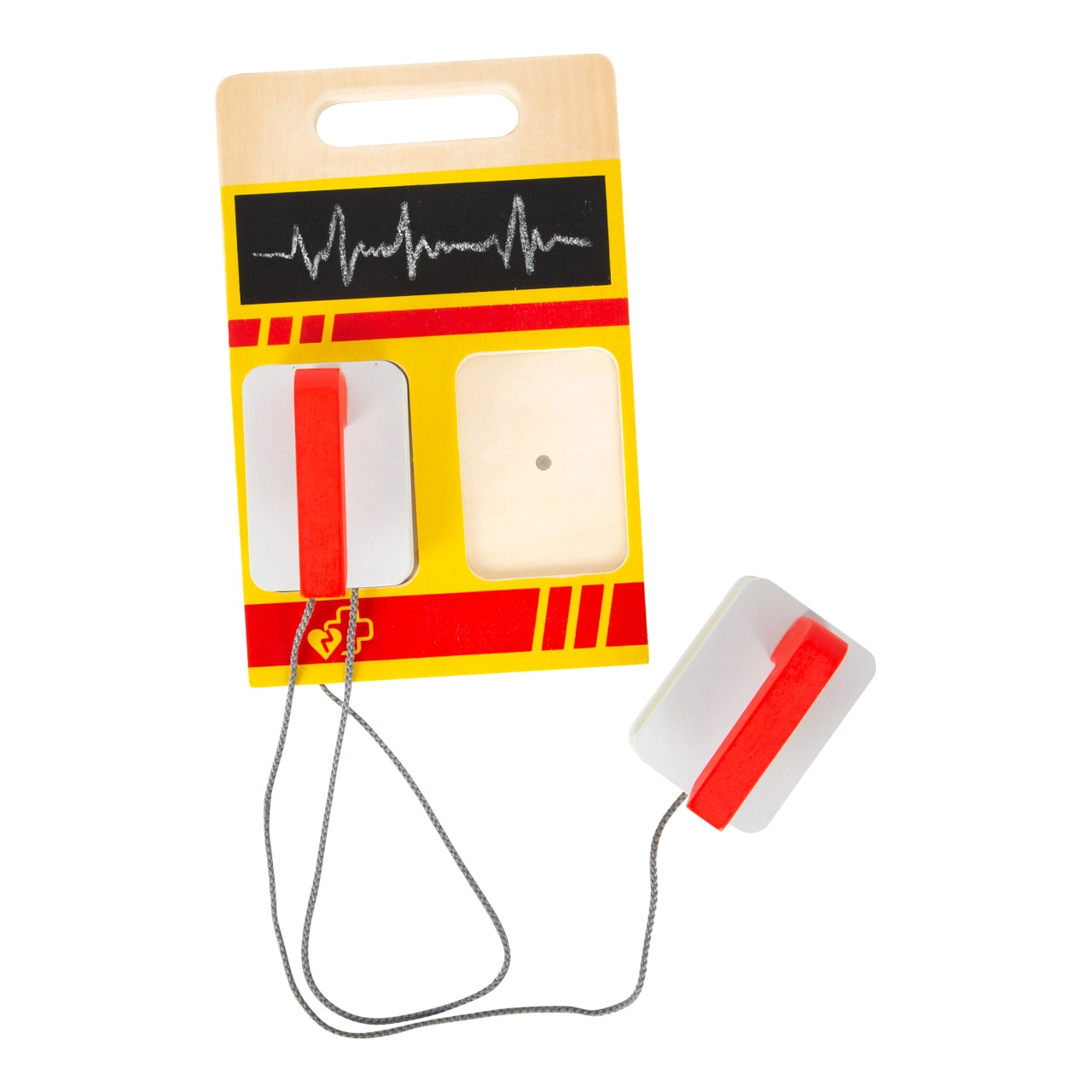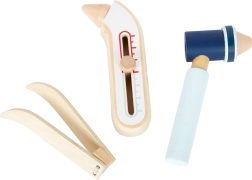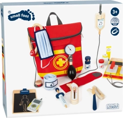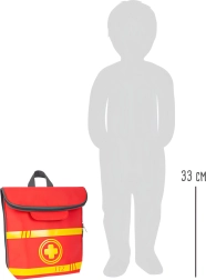 Тази спасителна раница е идеална за детска игра на доктор. Вътре ще намерите дървени инструменти като стетоскоп, термометър, отоскоп с лупа и дори дефибрилатор. Децата могат да се научат да разпознават медицинско оборудване и да симулират спасителни процедури.