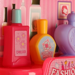В комплекта има гребени, огледалце, шишенца, аксесоари за коса и други реквизити за реалистична игра на фризьор и козметика.